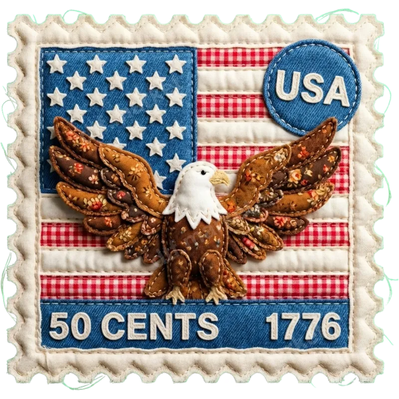 See allThis unique DTF transfer showcases a charming vintage Americana design, resembling a quilted postage stamp. It features a majestic bald eagle with wings spread, set against a classic American flag pattern of stars on blue and red-and-white gingham stripes. The design is framed by a stamp-like edge and includes text elements like "USA," "50 CENTS," and "1776," evoking historical patriotism and folk art charm. This ready to press transfer brings a touch of rustic heritage to any garment. Perfect for patriots, history enthusiasts, or anyone who loves the vintage Americana aesthetic, this heat press design is ideal for Fourth of July, Memorial Day, Veterans Day, or everyday wear. It makes an excellent gift for dads, grandparents, or military families, allowing them to proudly display their American spirit. Use it to customize clothing for family reunions, historical events, or themed parties. Our high-quality t-shirt transfer is incredibly versatile, applying to cotton, polyester, and various blends. For best results, use a heat press at 300-325°F for 15 seconds with medium pressure. It's also suitable for household irons, with clear instructions provided. Enjoy a hassle-free customization experience, as there's absolutely no weeding required with this iron on transfer. Experience superior quality with our professionally printed direct to film transfers. Each design boasts vibrant colors, exceptional detail, and a soft-to-the-touch finish. Engineered for durability, this apparel transfer is crack-resistant, fade-resistant, and designed to withstand countless washes, ensuring your patriotic statement remains bold and beautiful.