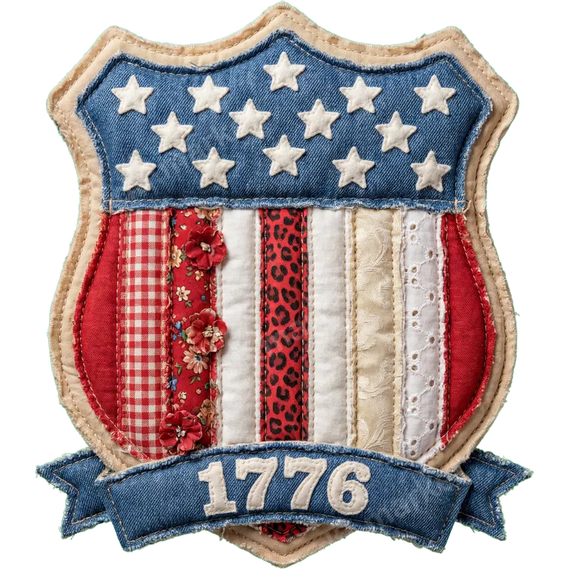 See allThis exquisite DTF transfer features a charming, vintage-inspired patriotic shield, artfully designed with a rustic, quilted aesthetic. Adorned with 13 stars on a denim-textured blue background and vibrant mixed fabric stripes including gingham, floral, and a touch of leopard print, this unique design beautifully frames the year "1776" on a denim banner. It’s a truly captivating direct to film transfer, ready to press onto your favorite items with ease. Perfect for celebrating American heritage, this heat press ready design is ideal for anyone who loves vintage Americana style or desires to showcase their patriotic spirit with unique craftsmanship. It's a fantastic choice for 4th of July festivities, Memorial Day celebrations, or as a thoughtful gift for history buffs and DIY enthusiasts. Elevate your wardrobe or create memorable items with this distinctive iron on transfer. Applying this high-quality heat transfer is simple for both beginners and experienced crafters. Our professional-grade ready to press transfer adheres beautifully to cotton, polyester, and blends. For best results, use a heat press at 300-325°F for 15 seconds with medium pressure, then peel cold. A household iron can also be used with firm, even pressure. Best of all, there’s no weeding required, saving you time and effort. Experience superior results with our premium apparel transfer, designed for lasting beauty and durability. Each vibrant custom transfer boasts rich colors that resist cracking and fading, ensuring your finished product looks fantastic wear after wear. The soft-to-touch feel and strong adhesive of our professional DTF film ensure a comfortable, long-lasting embellishment that truly stands out.