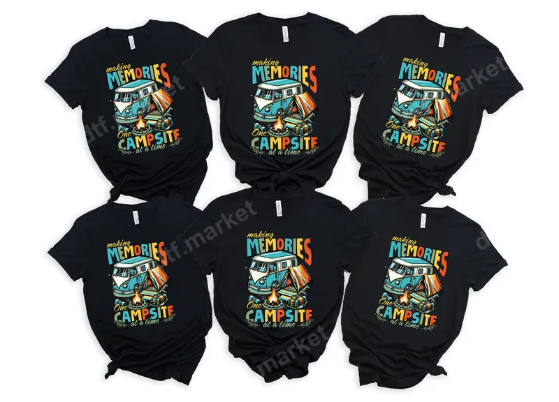 See allEmbrace the spirit of adventure with this charming 'Making Memories One Campsite at a Time' DTF transfer. This vibrant design features a classic retro blue camper van, a cozy tent, and a crackling campfire, capturing the essence of outdoor exploration. It's a high-quality direct to film transfer, offering rich colors and intricate details, making it the perfect ready to press transfer for your next custom apparel project. This nostalgic design is ideal for campers, RV enthusiasts, road trippers, and anyone who cherishes family camping memories. It makes a fantastic gift for Father's Day, birthdays, or as matching shirts for your next family vacation or group camping trip. Personalize your gear and show off your love for the great outdoors with this unique heat press design. Our heat transfer applies effortlessly to a wide variety of fabrics, including cotton, polyester, and their blends. Achieve professional results using a heat press at 300-325°F for 15 seconds with medium pressure. For smaller projects or personal use, it can also be applied with a household iron. Enjoy the convenience of no weeding required, making custom apparel creation simple and fun, much like applying an iron on decal. Crafted with premium DTF film and strong adhesive, this t-shirt transfer delivers exceptional durability. The design is celebrated for its vibrant colors that resist cracking and peeling, maintaining a soft, flexible feel on your garment. Create long-lasting, memorable apparel that feels as good as it looks with this top-tier ready to press design.