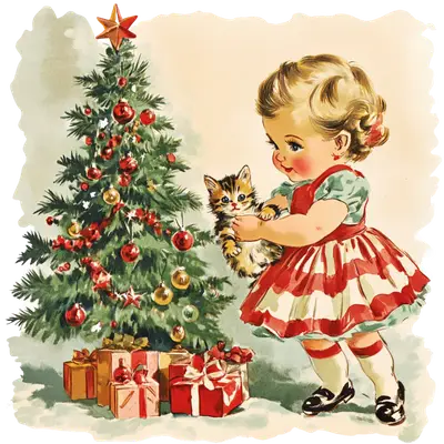 Vintage Christmas Girl & Kitten DTF Transfer | Retro Holiday Design