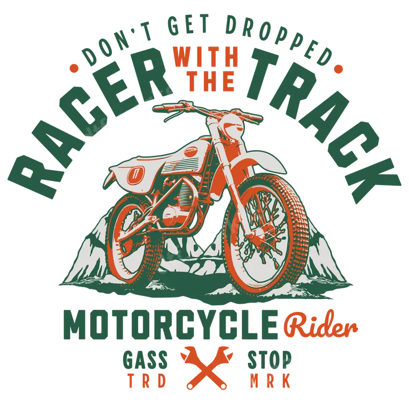 See allThis vintage-inspired DTF transfer features a classic dirt bike against a rugged mountain landscape, exuding an adventurous, off-road racing spirit. The design showcases "DON'T GET DROPPED WITH THE RACER TRACK" and "MOTORCYCLE Rider," framed by "GASS TRD" and "STOP MRK" with crossed wrenches, capturing the essence of a dedicated biker. This eye-catching heat transfer is ready to press, allowing you to easily transform your apparel. Perfect for motocross fans, dirt bike riders, vintage motorcycle collectors, and anyone who loves the thrill of the open trail. This design makes an excellent gift for Father's Day, birthdays, or for adding personalized flair to team gear, casual wear, or event merchandise for races and rallies. It’s an ideal iron on transfer for crafting unique gifts or showing off your passion for two-wheeled adventure. Applying this apparel transfer is a breeze, compatible with cotton, polyester, and cotton-poly blends. For professional results, use a heat press at 300-325°F for 15 seconds with medium pressure, followed by a cool peel. While a heat press is recommended for best adhesion, a household iron can also be used. No weeding required, making customization quick and effortless. Crafted using premium DTF film, this ready to press transfer boasts exceptional quality. The colors are vibrant and true to the design, ensuring your finished product stands out. Our transfers are engineered for durability, offering excellent washability, crack resistance, and a soft, flexible feel that seamlessly integrates with your garment. Enjoy a professional-grade shirt design that lasts.