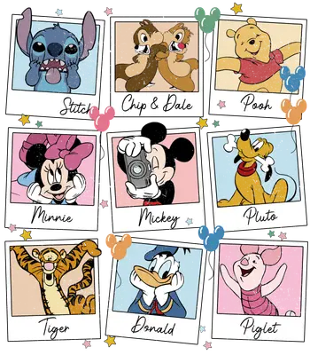 Vintage Disney Characters Polaroid Collage DTF Transfer | Mickey Minnie Pooh Stitch