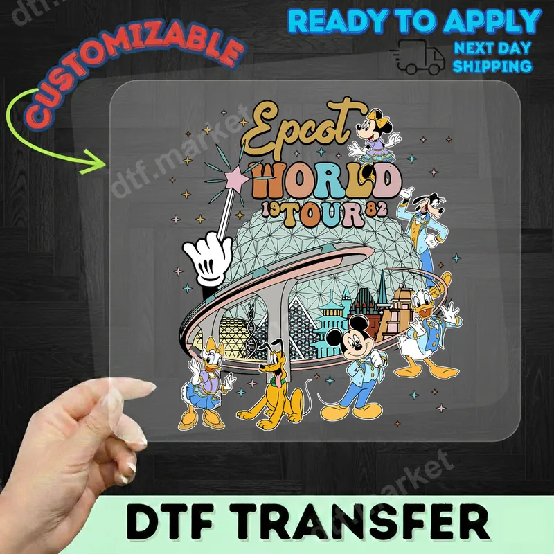 See allRelive the magic of 1982 with this exclusive Vintage Epcot World Tour DTF transfer. This vibrant design captures the nostalgic charm of Epcot's early days, featuring Spaceship Earth surrounded by classic Disney characters like Mickey Mouse, Minnie Mouse, Donald Duck, Daisy Duck, Goofy, and Pluto, all dressed in retro-inspired attire. This high-quality direct to film transfer is ready to press, making it incredibly easy to bring your vintage Disney vision to life on any garment. This iconic heat press design is perfect for Disney enthusiasts, Epcot devotees, and anyone who loves a touch of 80s nostalgia. Ideal for creating matching family vacation shirts, unique gifts for Disney fans, or custom apparel for your next trip to Walt Disney World. Imagine customizing t-shirts, sweatshirts, or tote bags with this timeless apparel transfer to showcase your love for classic Disney parks and characters. Applying this iron on transfer is simple and mess-free. It works beautifully on a wide range of fabrics including cotton, polyester, and blends. For best results, use a heat press at 300-325°F for 15 seconds with medium pressure, then cold peel. A household iron can also be used with firm, even pressure. Say goodbye to tedious weeding – our ready to press transfers are designed for effortless application. Experience superior quality with our professional-grade DTF film. This t-shirt transfer boasts incredibly vibrant colors that pop, is highly crack-resistant, and leaves a soft, comfortable feel on your garment. The strong adhesive ensures your design stays put, providing a durable and long-lasting finish that stands up to countless washes, letting you enjoy your retro Epcot design for years to come.