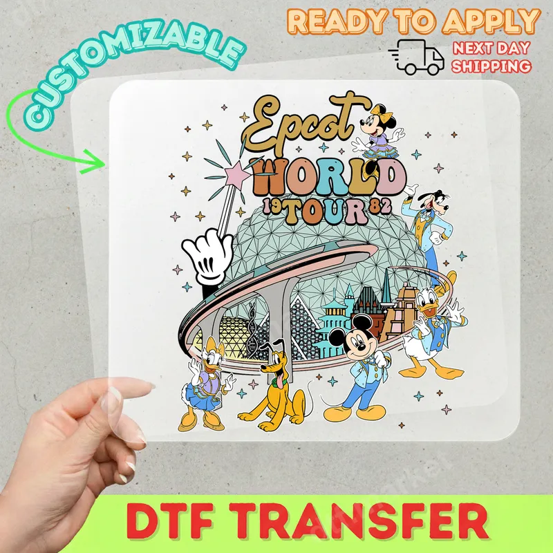 See allStep back in time to 1982 with this captivating Epcot World Tour DTF transfer, celebrating the inaugural year of this iconic Disney park. This vibrant direct to film transfer features beloved classic characters like Mickey, Minnie, Donald, Daisy, Goofy, and Pluto, all adorned in charming vintage attire, set against the backdrop of Spaceship Earth and global landmarks. A magical hand with a wand completes this nostalgic design, making it a perfect ready to press heat press design for any Disney enthusiast. This retro Epcot apparel transfer is ideal for Disney vacation planners, theme park goers, and fans of vintage Disney aesthetics. Perfect for family trip matching shirts, birthday gifts, or simply adding a touch of classic Disney magic to your everyday wardrobe. It’s also a fantastic iron on transfer for crafting personalized items for fellow Disney adults or children. Applying this heat transfer is effortless. It works wonderfully on a wide range of materials, including cotton, polyester, and various fabric blends. For best results, use a heat press at 300-325°F for 15 seconds with medium pressure, then cold peel. For home crafters, a household iron can also be used following careful instructions. There's no complex weeding required, just press and enjoy your custom creation. Crafted with professional-grade DTF film, this ready to press transfer boasts exceptional color vibrancy and durability. Your new shirt design will be crack-resistant, wash-fast, and remarkably soft to the touch, ensuring a high-quality finish that stands the test of time. Transform your garments and accessories with this high-quality, long-lasting print.