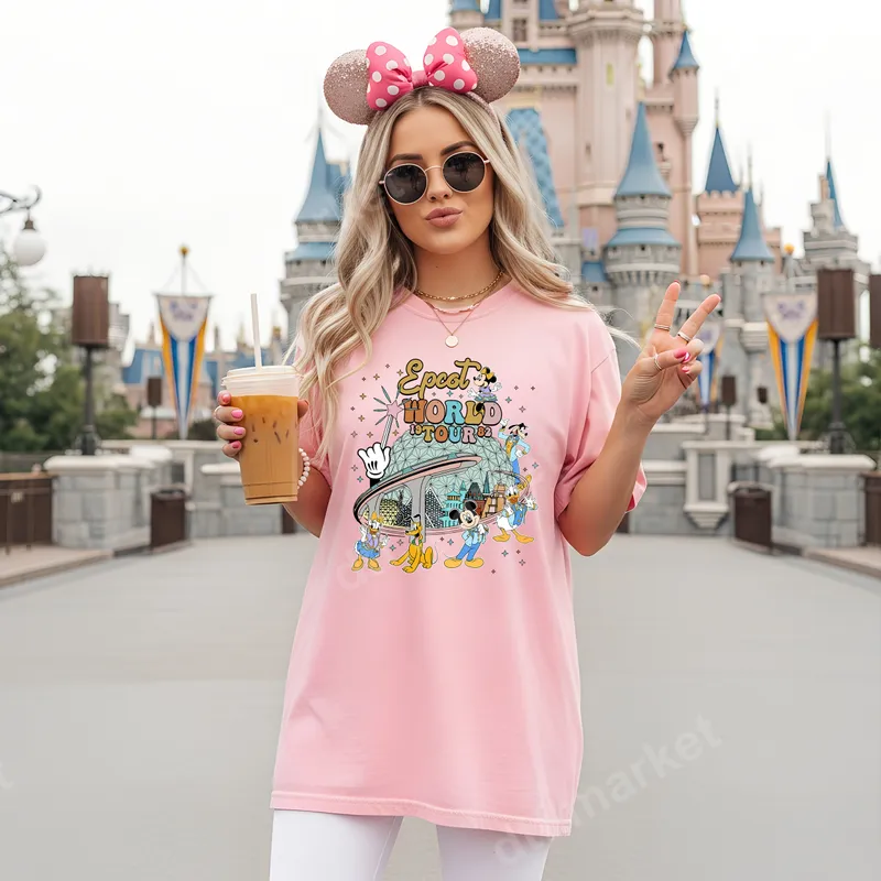 See allThis vibrant DTF transfer captures the timeless magic of Epcot with a fun, retro "World Tour '82" design. Featuring beloved Disney characters like Mickey Mouse, Minnie, Donald, Goofy, Pluto, Daisy, Chip, and Dale surrounding the iconic Spaceship Earth, this heat press ready design is bursting with nostalgic charm. The playful, colorful artwork evokes a classic theme park adventure, perfect for adding a touch of vintage Disney whimsy to any garment. Ideal for Disney adults, theme park enthusiasts, and families planning a magical vacation, this unique design makes a fantastic statement piece. It's perfect for coordinating outfits for a trip to Disney World, celebrating a birthday, or simply showing off your love for classic Disney. This versatile heat transfer also makes an excellent gift for any Disney fan, adding a personalized touch to their wardrobe or accessories. Our premium DTF (Direct-to-Film) transfers are incredibly easy to apply to a wide range of materials. They work beautifully on cotton, polyester, cotton/poly blends, and even tri-blends. For best results, use a heat press at 300-325°F for 15 seconds with medium, even pressure. This iron on transfer requires no weeding, ensuring a smooth and hassle-free application process. You can also achieve great results with a household iron, making custom apparel accessible to everyone. Experience superior quality with our professional-grade heat press designs. Each transfer boasts vibrant, crisp colors and exceptional detail that stand up to countless washes without cracking, peeling, or fading. The specialized DTF film ensures a soft, flexible feel that seamlessly integrates with your fabric, unlike bulky vinyl transfers. Get ready to create durable, high-quality custom apparel with these amazing ready to press transfers.