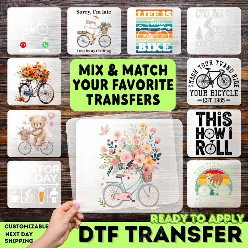See allEmbrace nature's charm with our exquisite Floral Bicycle DTF transfer, a captivating ready to press design. This artwork features a vintage-style bicycle in soft aqua, its front basket overflowing with vibrant wildflowers. Delicate pinks, sunny yellows, soft oranges, and lush greens create a whimsical garden scene, enhanced by a graceful butterfly. This heat transfer captures a serene, cottagecore aesthetic, perfect for adding rustic elegance to any garment. This charming heat press ready design is ideal for anyone who loves cycling, gardening, or vintage aesthetics. It makes a wonderful iron on transfer for personalized gifts on Mother's Day, birthdays, or simply 'just because'. Perfect for women, teens, and grandmothers, this design suits spring and summer wardrobes, garden party attire, or casual everyday wear. Create unique gifts for bike enthusiasts, nature lovers, or anyone who appreciates feminine floral artistry. Applying your new bicycle DTF transfer is incredibly easy and hassle-free. Our high-quality direct to film transfers adhere beautifully to fabrics like 100% cotton, polyester, cotton/poly blends, and tri-blends. For best results, use a heat press at 300-325°F for 15 seconds with medium pressure, then peel cold. Great results are also achievable with a household iron. There's no weeding or layering required, making customization quick and simple. Experience superior quality with our professional-grade apparel transfers. Each DTF print boasts vibrant colors, exceptional detail, and a soft, smooth feel that won't crack or peel, ensuring long-lasting durability. These t-shirt transfers are produced using premium DTF film and high-quality ink, providing a professional finish that will make your customized items stand out. Elevate your apparel and accessories with a design that's as durable as it is beautiful.