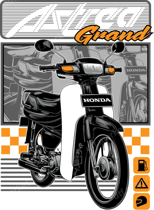 See allCapture the timeless cool of the iconic Honda Astrea Grand with this stunning DTF transfer. This detailed illustration features the beloved vintage motorcycle in classic black, white, and grey, accented with vibrant orange details and a racing-inspired checkerboard pattern. 'ASTREA Grand' lettering and subtle background graphics complete this perfect statement piece. This high-quality direct to film transfer is ready to press, bringing a unique retro vibe to any garment. Ideal for motorcycle enthusiasts, classic bike collectors, Honda fans, and anyone who appreciates vintage vehicle aesthetics. This ready to press transfer makes an excellent gift for dads, brothers, or friends passionate about two-wheelers. Perfect for everyday wear, motorcycle rallies, mechanic shops, or as a unique iron on decal to personalize your gear. Showcase your love for classic motorsports culture. Applying your new heat transfer is incredibly simple. Our premium DTF transfers work flawlessly on a wide range of fabrics, including cotton, polyester, and cotton-poly blends. For best results, use a heat press at 300-325°F for 15 seconds with medium pressure. A household iron can also be used following our instructions. Enjoy the convenience of a t-shirt transfer that requires no weeding or intricate cutting. Experience superior durability and a professional finish with every application. Our advanced DTF film ensures vibrant, crisp colors that resist cracking, peeling, and fading, even after multiple washes. The soft-touch feel of this apparel transfer integrates beautifully with your fabric, ensuring maximum comfort. Choose dtf.market for a premium heat press ready design that combines intricate style with lasting quality.