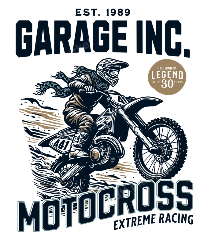 See allThis electrifying DTF transfer features a high-energy, vintage-style illustration of a motocross rider in action, kicking up dirt. The design, with "GARAGE INC. EST. 1989" and "MOTOCROSS EXTREME RACING," captures the raw thrill of off-road motorsports. It’s a ready to press transfer that brings adrenaline and dirt bike racing heritage to any garment, perfect for custom apparel. This heat press design is ideal for motocross enthusiasts, dirt bike riders, extreme sports fans, and anyone passionate about vintage racing culture. It makes an excellent gift for birthdays, Father's Day, or for customizing gear for race events, rallies, and casual wear. Create unique t-shirts, hoodies, jackets, or hats for your favorite rider or mechanic. Our direct to film transfers are incredibly versatile and easy to apply, working flawlessly on cotton, polyester, and various blends. For best results, use a heat press at 300-325°F for 15 seconds with medium pressure. These iron on decals require no weeding or complex preparation, ensuring a smooth, professional finish. You can even use a household iron for simple application. Experience superior quality with our professional-grade apparel transfers. Each design is printed on premium DTF film, ensuring vibrant colors, crisp details, and exceptional durability. These transfers are crack-resistant, peel-resistant, and boast a soft, flexible feel. Our heat transfer designs provide strong adhesion, delivering long-lasting wear, wash after wash.