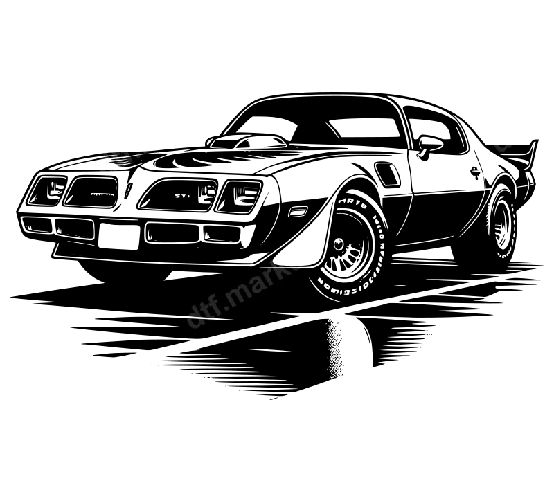 See allThis striking DTF transfer features a classic American muscle car, reminiscent of a late 70s Pontiac Firebird Trans Am, captured in a bold, black-and-white vector art style. The design showcases the iconic lines and powerful stance of this legendary vehicle, complete with intricate details on the wheels and bodywork, all resting on a stylized reflective surface. It's a ready to press design that perfectly embodies the raw energy and timeless cool of vintage automotive culture, making it an ideal choice for anyone looking to add a touch of retro horsepower to their apparel. This ready to press transfer is perfect for car enthusiasts, hot rod lovers, and anyone with a passion for classic Americana and muscle car culture. It makes an excellent gift for dads, grandpas, or friends who appreciate automotive history and powerful designs. Ideal for car shows, vintage events, or simply expressing your love for classic rides, this heat press transfer can personalize gear for mechanic shops, auto clubs, or personal wardrobe. It's also great for birthdays, Father's Day, or just because. Our direct to film transfers are incredibly versatile and easy to apply, working flawlessly on a wide range of fabric types including cotton, polyester, and various blends. For best results, use a heat press at 300-325°F for 15 seconds with medium pressure, then cool peel. For home crafters, a household iron can also be used with firm, even pressure. Unlike traditional vinyl transfers, there's absolutely no weeding required, saving you time and effort while ensuring a perfect, professional finish every time. Experience superior quality with our premium DTF transfers. Each iron on transfer boasts vibrant colors and crisp details, ensuring your design stands out with solid black and white contrast. They are engineered to be crack-resistant, peel-resistant, and incredibly soft to the touch, providing long-lasting wear and comfort. Made with professional-grade DTF film and strong adhesive, these apparel transfers are designed to integrate seamlessly into the fabric, providing durability and a high-end feel that endures wash after wash.