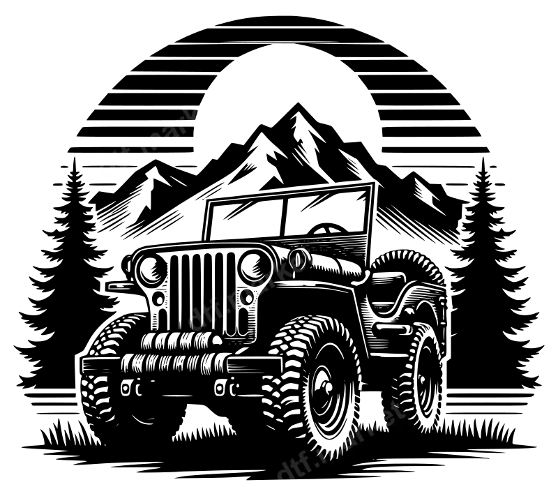 See allThe Vintage Off-Road Jeep Mountain DTF Transfer is a bold, black-and-white graphic featuring a classic 4x4 vehicle set against a stunning backdrop of rugged mountains, towering pine trees, and a striking horizontal-striped sun. This intricate design captures the spirit of adventure and the timeless appeal of off-road exploration, making it the perfect ready to press design for anyone who loves the great outdoors and a touch of retro style. This unique design is ideal for off-road enthusiasts, avid campers, hikers, and anyone who appreciates vintage vehicle aesthetics and nature-inspired themes. It makes an excellent gift for dads, brothers, or friends who enjoy adventure sports, weekend getaways, or simply the thrill of driving off the beaten path. Perfect for personalizing apparel for outdoor events, camping trips, or adding a rugged touch to everyday casual wear. Applying this premium DTF transfer is simple and efficient, transforming your items in minutes. It works seamlessly on a wide range of fabrics, including cotton, polyester, and various blends, ensuring versatility for your customization projects. For best results, use a heat press at 300-325°F for 15 seconds with medium pressure. A household iron can also be used with care. There's no tedious weeding required, making your customization process quick and hassle-free. Experience superior quality with this heat press ready design. Our DTF transfers boast vibrant, long-lasting prints that resist cracking and fading, maintaining their integrity wash after wash. The professional DTF film ensures a soft hand feel and strong adhesive properties, providing a durable iron on transfer that integrates beautifully into your chosen garment, delivering a professional finish every time. This is the ultimate t-shirt transfer for your adventurous spirit.