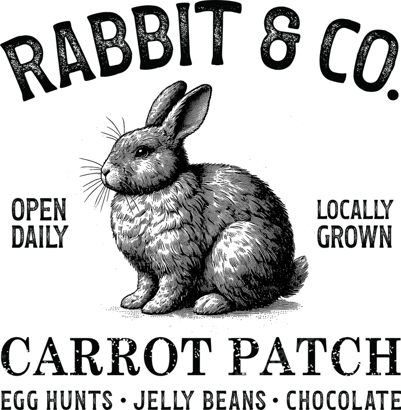 See allThis charming DTF transfer features a classic, engraved-style rabbit framed by "RABBIT & CO." and "CARROT PATCH." With details like "OPEN DAILY," "LOCALLY GROWN," and "EGG HUNTS • JELLY BEANS • CHOCOLATE," it evokes a nostalgic, rustic farm stand or general store vibe. This high-quality, ready to press design brings a delightful vintage touch to any fabric item, perfect for spring and holiday festivities. Ideal for anyone who loves vintage aesthetics, farm-themed designs, or celebrating Easter and springtime. This heat press design makes a fantastic addition to custom apparel for family egg hunts, spring festivals, or simply adding a cozy, rustic feel to everyday wear. It’s a wonderful gift idea for small business owners looking to create unique merchandise or for crafters making personalized items for friends and family. Create festive t-shirts, adorable baby onesies, or charming tote bags with this versatile iron on transfer. Applying this direct to film transfer is straightforward and ensures professional results. It adheres beautifully to a wide range of materials, including cotton, polyester, and various fabric blends. For best application, use a heat press at 300-325°F for 15 seconds with medium pressure, then cold peel the film. A household iron can also be used with careful, even pressure. Enjoy a seamless application process with no weeding required, making custom apparel creation quick and hassle-free. Crafted with professional-grade DTF film, this apparel transfer promises vibrant colors and exceptional durability. The design is engineered to be crack-resistant and soft to the touch, ensuring your finished garment maintains its comfort and aesthetic appeal wash after wash. The strong adhesive guarantees a long-lasting bond to your fabric, making it a reliable choice for any project. Experience the quality and ease of a premium DTF transfer, perfect for all your custom shirt design needs.