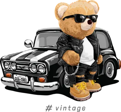 Vintage Teddy Bear in Leather Jacket with Classic Car DTF Transfer