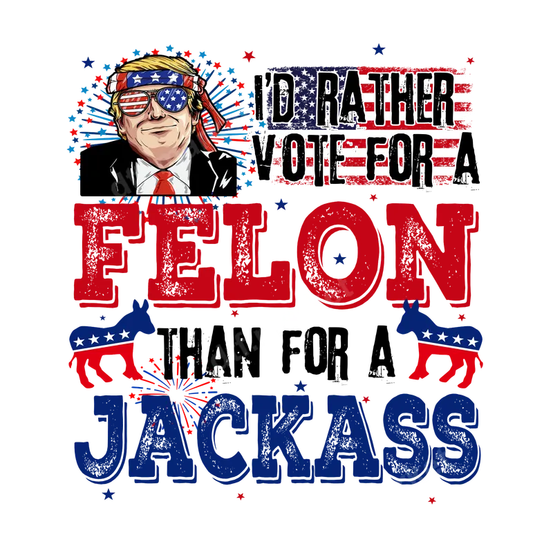 See allThis vibrant DTF transfer features a distinctive caricature of Donald Trump, proudly sporting an American flag bandana and star-spangled sunglasses. The design boldly proclaims, "I'D RATHER VOTE FOR A FELON THAN FOR A JACKASS," set against a backdrop of patriotic red, white, and blue elements, including distressed flag textures and subtle donkey silhouettes. This striking ready to press transfer is perfect for expressing a strong, humorous political stance. With its clear message and eye-catching visuals, it’s an ideal way to show your support with a bit of edgy wit. This heat press ready design is perfect for conservative voters, Trump supporters, and anyone with a robust sense of political humor looking to make a statement. It makes an excellent gift for friends and family involved in politics, attending rallies, or simply for wearing during election season. Ideal for casual wear, political events, or as a conversation starter, this iron on transfer allows you to wear your views on your sleeve (literally!). Stand out from the crowd and let your apparel do the talking. Applying this heat transfer is straightforward and efficient. It works beautifully on a wide variety of materials, including 100% cotton, 100% polyester, and all poly-cotton blends. For best results, use a heat press at 280-300°F for 6-10 seconds with medium pressure, then peel instantly. No weeding is required, making application quick and hassle-free. If you don't have a heat press, a household iron can also be used for a smooth, durable application of this ready to press design. Each high-quality apparel transfer is designed for maximum impact and longevity. Our professional DTF film ensures vibrant, full-color reproduction that won't crack, peel, or fade, even after multiple washes. The transfers are soft to the touch, seamlessly integrating into the fabric for a comfortable feel. Enjoy a durable, professional-grade print that maintains its brilliant colors and sharp details, making this the perfect t-shirt transfer for any garment.