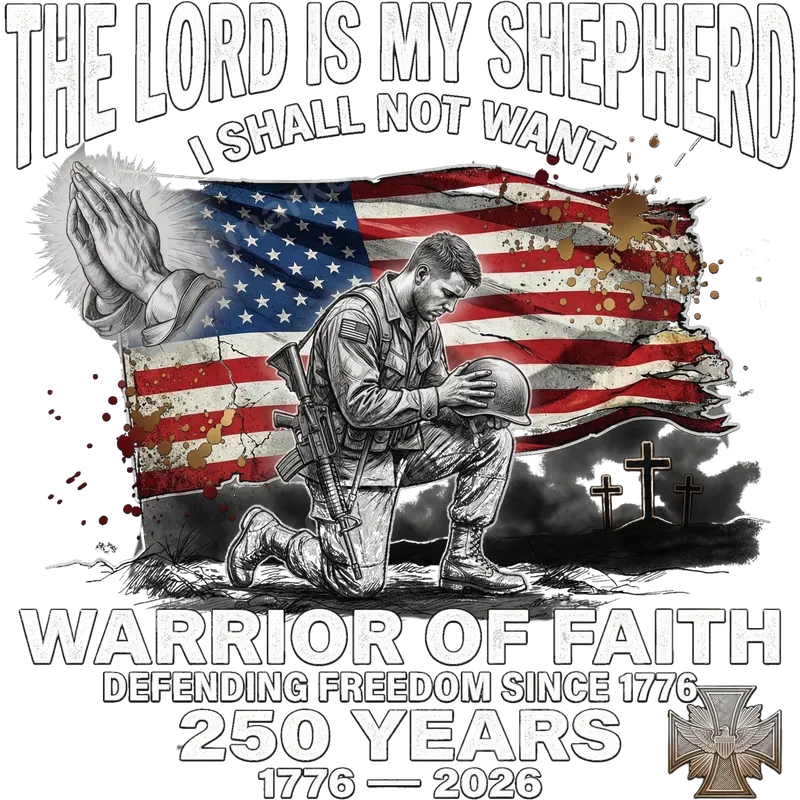 See allThis powerful DTF transfer beautifully combines profound faith with unwavering patriotism. Featuring a kneeling soldier in solemn reflection before a tattered American flag, flanked by praying hands and crosses, it’s a design that speaks volumes. Above, the comforting scripture "The Lord is My Shepherd I Shall Not Want" is emblazoned, alongside "Warrior of Faith Defending Freedom Since 1776, 250 Years 1776 - 2026." This ready to press design is a tribute to those who serve God and country. Ideal for veterans, active military personnel, patriotic Americans, and devout Christians, this heat transfer makes a deeply meaningful statement. It’s perfect for commemorating patriotic holidays like Memorial Day, Veterans Day, or the 4th of July, or as a thoughtful gift for a loved one in service or anyone who cherishes faith and freedom. This powerful t-shirt transfer is a wonderful way to express deeply held values. Applying this stunning iron on transfer is simple and efficient. It works flawlessly on a wide range of fabrics, including cotton, polyester, and various blends, ensuring versatility for your projects. For best results, use a heat press at 300-325°F for 15 seconds with medium pressure, followed by a cold peel. A household iron can also be used, though a heat press is recommended for professional quality. Say goodbye to weeding; this heat press design comes perfectly cut and ready for application. Experience exceptional quality with our direct to film transfers. Each design boasts vibrant colors, superior detail, and outstanding durability, ensuring it won't crack, peel, or fade over time. The soft-touch finish integrates seamlessly with your garment, providing a comfortable feel. Crafted using professional-grade DTF film with a strong, reliable adhesive, our custom transfers are built to last, making your apparel truly stand out.