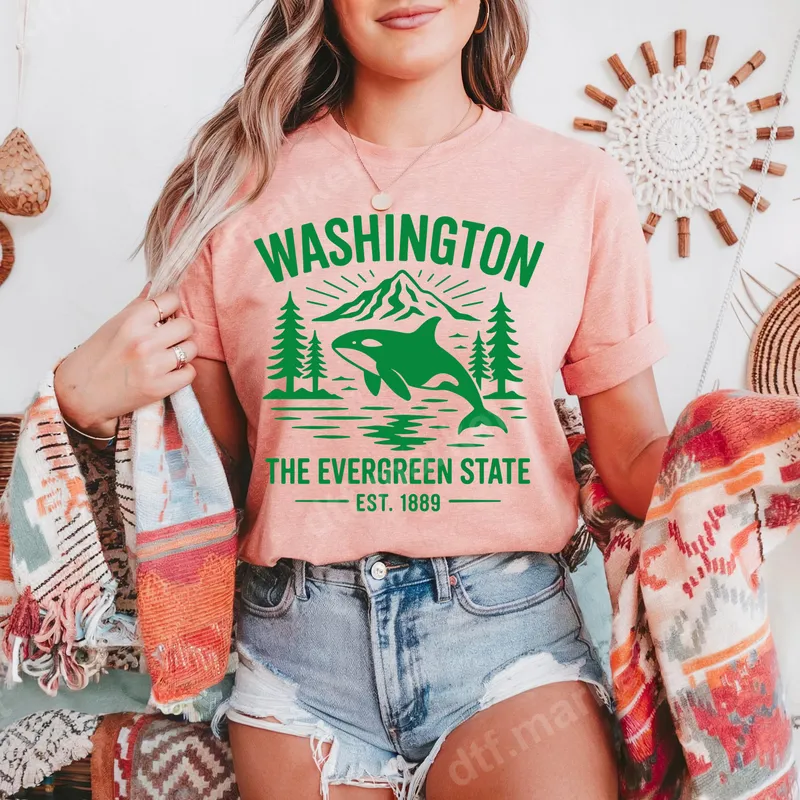 See allThis vibrant "Washington The Evergreen State" DTF transfer beautifully captures the iconic spirit of the Pacific Northwest. Featuring a majestic orca swimming in water, framed by towering mountains and lush pine trees, this ready to press design evokes a sense of natural beauty and state pride. The bold green lettering and vintage-inspired aesthetic make it a standout choice for anyone celebrating the Evergreen State, established in 1889. This versatile heat press transfer is ideal for Washington state residents, PNW enthusiasts, outdoor adventurers, and anyone who loves killer whales and scenic landscapes. It makes a fantastic souvenir for tourists, a thoughtful gift for friends and family, or a unique way to show local pride. Perfect for casual wear, outdoor events, hiking trips, or simply expressing your connection to Washington's natural wonders. Applying your new direct to film transfer is effortless. Our high-quality iron on decal works seamlessly on a wide range of fabrics, including 100% cotton, polyester, and various blends. For best results, use a heat press at 300-325°F for 15 seconds with medium pressure, then cold peel. While a heat press is recommended, you can also achieve great results with a household iron. Forget the hassle of weeding vinyl transfers; this design is ready to go! Experience professional-grade results with every apparel transfer. Our DTF transfers boast vibrant colors that pop, superior crack resistance for long-lasting wear, and a soft-to-touch finish that feels like part of the fabric. Crafted using premium DTF film and strong adhesive, these shirt designs ensure maximum durability and washability, making your custom garments look fantastic for years to come.