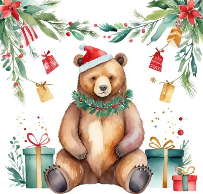 Watercolor Christmas Bear DTF Transfer with Santa Hat & Gifts