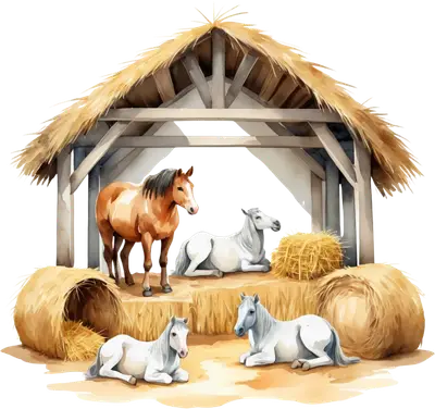 Watercolor Horses in Stable DTF Transfer with Hay Bales