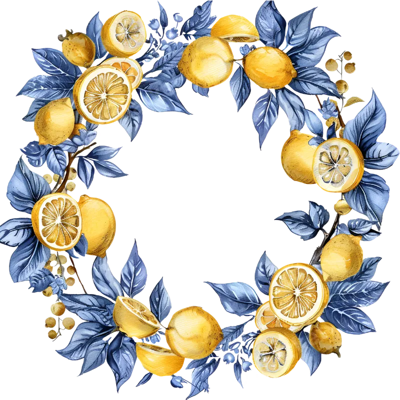 Watercolor Lemon & Blue Leaf Wreath DTF Transfer | Ready to Press Botanical Design