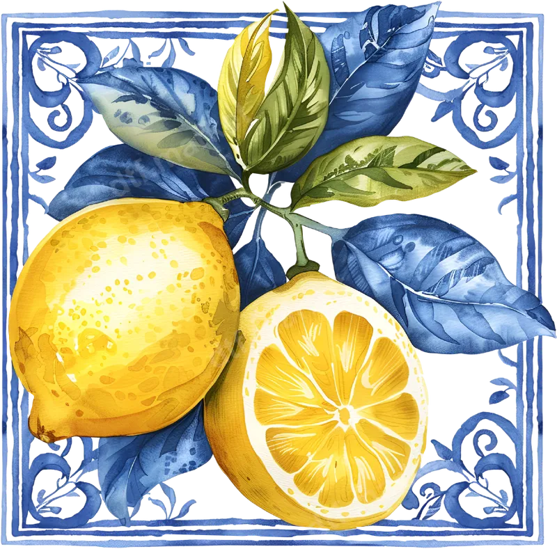 Watercolor Lemon Branch & Slices DTF Transfer | Blue Tile Art