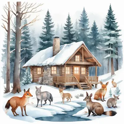 Watercolor Winter Cabin & Woodland Animals DTF Transfer