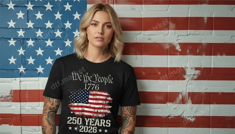 See allThis striking 'We the People 1776' DTF transfer proudly showcases a distressed American flag design, commemorating the nation's upcoming 250th anniversary in 2026. Featuring the iconic phrase from the U.S. Constitution and the foundational year 1776, this design captures a deep sense of patriotism and historical pride. It's a perfect ready to press transfer for those who cherish American heritage and the principles of liberty and independence. Our high-quality DTF transfers ensure vibrant colors and crisp details for a professional finish on any garment. This versatile heat press design is ideal for patriots, history enthusiasts, veterans, and anyone proud of their American roots. Celebrate national holidays like the Fourth of July, Memorial Day, or Veterans Day, or simply express your civic pride year-round. It makes an excellent gift for military personnel, history teachers, or anyone participating in patriotic events leading up to the 250th anniversary. Create custom apparel for family reunions, commemorative gatherings, or everyday wear with this meaningful design. Applying this iron on transfer is straightforward, making custom apparel accessible to everyone. Our DTF transfers work beautifully on a wide range of materials, including 100% cotton, polyester, cotton/poly blends, and even denim. Simply use a heat press at 300-325°F for 15 seconds with medium pressure, then cold peel the film. For those without a heat press, a household iron can also be used following specific instructions. Best of all, there's no weeding required, saving you time and effort compared to traditional vinyl transfers. Experience the superior quality of our professional DTF transfers. Each direct to film transfer is engineered for exceptional durability, ensuring the design remains vibrant and crack-resistant wash after wash. The soft-touch feel integrates seamlessly with the fabric, providing a comfortable wear. With strong adhesive properties, this ready to press transfer ensures your shirt design or apparel transfer will look fantastic and last for years to come.