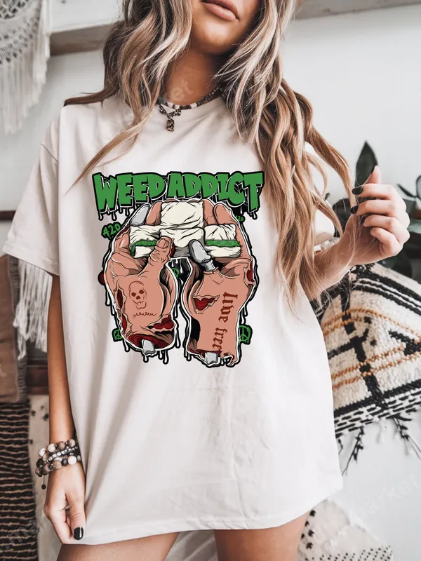 See allThis vibrant and edgy DTF transfer features bold "Weed Addict" text in dripping green, complementing an intricate graphic of tattooed hands. The hands are depicted holding cannabis buds, surrounded by green leaves, with a skull tattoo on one hand and "Live Free" on the other. This direct to film transfer embodies a distinct counter-culture aesthetic, perfect for those who embrace the 420 lifestyle. It comes ready to press, making customization effortless. This unique apparel transfer is ideal for cannabis enthusiasts, street culture aficionados, and anyone looking to make a statement. It's perfect for casual wear, music festivals, social gatherings, or as a distinctive gift for friends who appreciate alternative fashion and the cannabis community. Celebrate 4/20, a birthday, or simply express your individuality with this bold heat press design. Applying this versatile heat transfer is straightforward on a wide range of fabrics, including cotton, polyester, and their blends. For best results, use a heat press at 300-325°F for 15 seconds with medium pressure, then cold peel. Alternatively, a household iron can be used following specific instructions. Unlike traditional vinyl transfers, there's no tedious weeding involved, ensuring a smooth and quick application process. Our professional-grade DTF transfers deliver exceptional quality, featuring vibrant colors that pop and a soft, smooth feel once applied. Crafted from durable DTF film with a strong adhesive, this iron on decal is designed to be crack-resistant and withstand numerous washes without fading. Your garment will maintain its professional look and feel, ensuring your custom creation lasts.