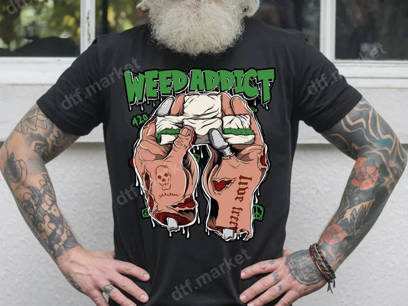 See allThis vibrant DTF transfer showcases "WEED ADDICT" in a dripping green font, reflecting an edgy street-art style. Below, stylized hands with a decayed look, subtle skull tattoo, and "Live Free" text are shown rolling a blunt. The design also features the "420" motif, instantly appealing to cannabis culture enthusiasts. This meticulously crafted heat press design is ready to press onto your favorite apparel. This unique heat press transfer is ideal for individuals embracing cannabis culture, street fashion, and edgy aesthetics. It's a perfect statement for casual wear, music festivals, or gatherings. Consider it a distinctive gift for birthdays, 4/20 celebrations, or for anyone who appreciates bold graphics and expressing their passion for cannabis culture with an artistic flair. Applying this direct to film transfer is straightforward. Our high-quality iron on decal works seamlessly on cotton, polyester, and blends. For best results, use a heat press at 300-325°F for 15 seconds (medium pressure, cold peel). A household iron can also achieve great results with consistent, firm pressure. This ready to press design requires no weeding, saving you time and effort. Experience superior quality with every t-shirt transfer from dtf.market. Our transfers boast vibrant, crack-resistant colors, ensuring your design stands out wash after wash. The finished design offers a soft, lightweight feel for comfort. We use professional-grade DTF film and strong adhesive to guarantee a long-lasting, professional finish on all your apparel.