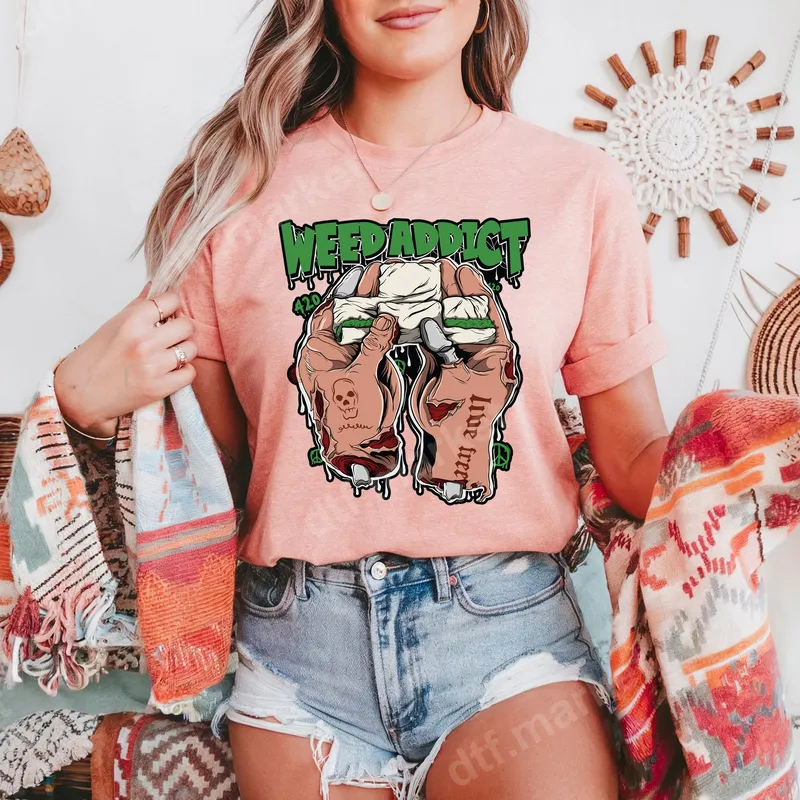 See allUnleash your unique style with this eye-catching "Weed Addict" DTF transfer, perfect for those who appreciate bold, stoner-themed designs. This vibrant print features two detailed zombie hands expertly rolling a joint, with the phrase "WEED ADDICT" in a cool dripping green font prominently displayed above. Subtle "420" details and a "live free" tattoo on one hand add to its edgy charm, making it a standout ready to press transfer for any garment. This distinct design is ideal for cannabis enthusiasts, individuals celebrating 420, or anyone looking to add some adult humor and counter-culture flair to their wardrobe. It makes a fantastic gift for friends who appreciate unique, humorous apparel or for personalizing items for festivals, parties, or casual everyday wear. Show off your personality and make a statement with this unforgettable graphic. Applying this heat press transfer is incredibly simple. It adheres flawlessly to a wide range of fabrics, including cotton, polyester, and various blends, ensuring versatility for your projects. For best results, use a heat press at 300-325°F for 15 seconds with medium pressure. It's also suitable for application with a household iron, making customization accessible to everyone. Forget about tedious weeding; this iron on decal is truly ready-to-go right out of the package. Experience the superior quality of our professional DTF transfers. This apparel transfer boasts vibrant colors that pop, exceptional crack resistance, and a soft-to-touch feel that integrates seamlessly with your fabric. Crafted with strong adhesive, your design will endure countless washes and wears, maintaining its sharp details and vivid hues for lasting enjoyment. Elevate your custom apparel game with dtf.market.
