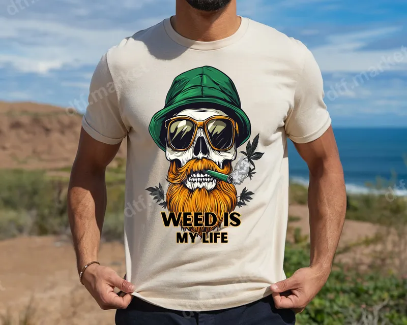 See allThis vibrant DTF transfer features a cool skull rocking sunglasses, a green bucket hat, a thick red beard, and casually puffing on a joint, surrounded by subtle cannabis leaves. Below the detailed artwork, the bold statement "WEED IS MY LIFE" stands out in a striking yellow and black font. This ready to press transfer perfectly captures a laid-back, humorous, and unapologetically cannabis-friendly vibe, ideal for making a statement on any garment. This unique heat press design is perfect for anyone in the cannabis culture, looking to express their humor and lifestyle. It makes an excellent gift for friends who appreciate witty, adult-themed apparel, or for personalizing your own wardrobe for festivals, casual outings, or just relaxing at home. Ideal for enthusiasts of 420 culture, hip-hop, or anyone with a chill, edgy style. Applying this premium iron on transfer is straightforward. It works seamlessly with a heat press at 300-325°F for 15 seconds with medium pressure, or can be applied effectively with a household iron (follow specific instructions for home irons). Our direct to film transfers adhere beautifully to cotton, polyester, and most fabric blends. Plus, there's absolutely no weeding required, saving you time and effort. Crafted with professional-grade DTF film, this apparel transfer promises exceptional quality. The colors are incredibly vibrant, the print is highly crack-resistant, and the final result has a soft, flexible feel against the fabric. You'll achieve a durable, long-lasting finish that stands up to washes, ensuring your personalized items look great for years to come.