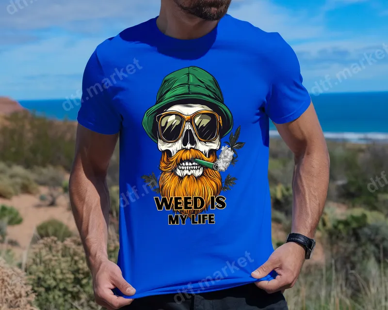 See allThis vibrant DTF transfer features a unique and edgy skull character, sporting a cool green bucket hat, stylish sunglasses, and a flowing orange beard, all while puffing on a blunt with cannabis leaves swirling around. The bold text "WEED IS MY LIFE" makes a clear, humorous statement, capturing a laid-back, rebellious, and unapologetic vibe. This eye-catching design is a perfect ready to press transfer for anyone looking to add personality to their apparel. This sarcastic-savage heat transfer is ideal for cannabis enthusiasts, casual stoners, or anyone with a bold sense of humor who loves unique graphic apparel. Perfect for casual wear, music festivals, chilling with friends, or as a witty gift for birthdays and holidays for those who appreciate adult humor. It’s a great conversation starter for social gatherings and makes a statement on any garment. Applying this high-quality heat press design is incredibly simple. Our DTF transfers work flawlessly on a wide variety of fabrics, including cotton, polyester, and their blends. For best results, use a heat press at 300-325°F for 15 seconds with medium pressure. It can also be applied with a household iron, following specific instructions. Best of all, there's absolutely no weeding required, making custom apparel creation quick and easy. Crafted using premium DTF film and state-of-the-art printing technology, this apparel transfer boasts incredibly vibrant colors and sharp details that truly pop. The transfers are designed to be crack-resistant, peel-resistant, and offer a soft, smooth feel once applied, ensuring long-lasting durability and comfort. You'll receive a professional-grade iron on transfer with strong adhesive, ready to transform your blank garments into wearable art.