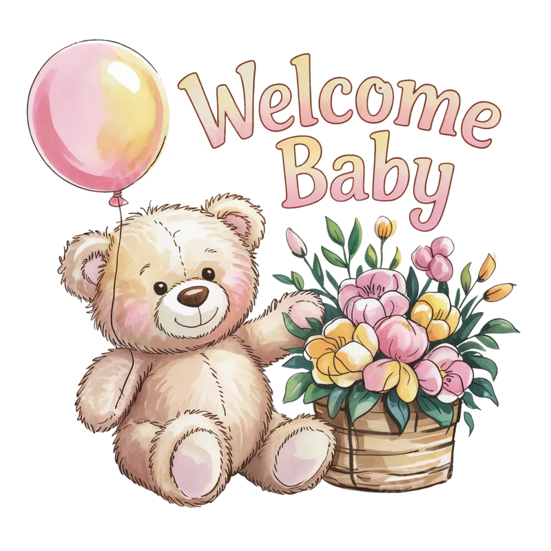 See allOur charming "Welcome Baby" DTF transfer features an adorable watercolor teddy bear holding a pink balloon, nestled beside a beautiful basket of pastel flowers. This delightful design captures the joy and tenderness of a new arrival, making it a perfect ready to press graphic for celebrating life's precious moments. The soft hues and intricate details bring a heartwarming touch to any garment or accessory. This sweet design is ideal for expecting parents, grandparents, or anyone celebrating a new addition. Perfect for baby shower gifts, gender reveal parties, or creating custom apparel for a newborn's homecoming. Use this versatile heat press transfer to personalize bodysuits, infant t-shirts, receiving blankets, or decorative items for a baby's room. It’s also a thoughtful gift for crafters. Applying this high-quality iron on transfer is a breeze with a professional heat press or household iron. It adheres beautifully to a wide range of fabrics, including 100% cotton, polyester, and blends. For best results, use a heat press at 300-325°F for 15 seconds with medium pressure. Unlike traditional vinyl, our DTF transfer requires no weeding, saving you time for a smooth, professional application. Experience vibrant colors and exceptional durability with our professional-grade DTF transfer. Crafted using premium inks and strong adhesive film, this t-shirt transfer is designed to be crack-resistant, fade-resistant, and incredibly soft to the touch. The superior quality ensures your custom creations will withstand countless washes while maintaining their stunning appearance, providing a lasting memory.