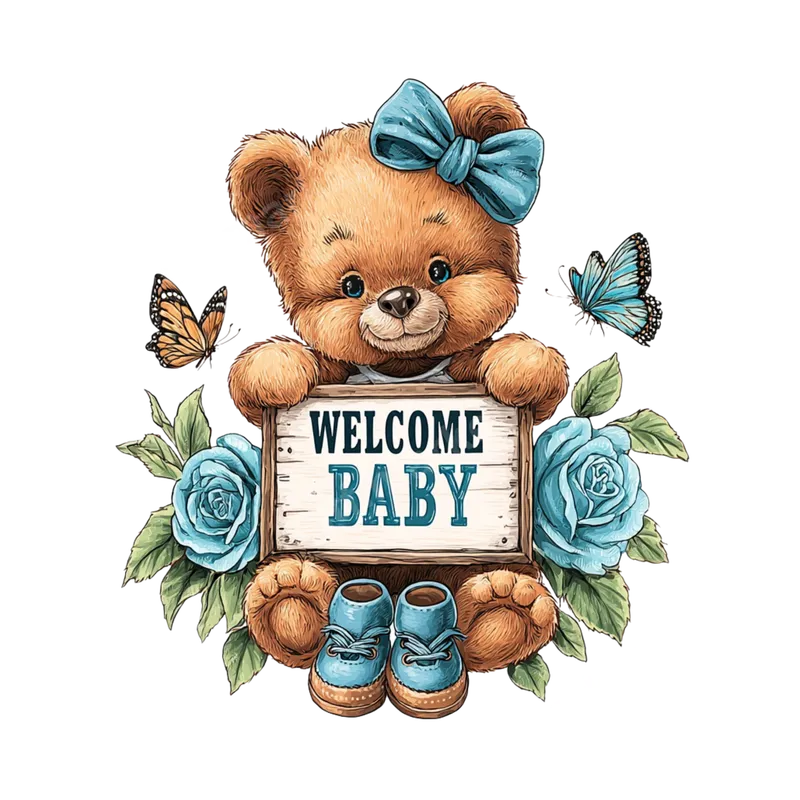 See allThis enchanting design features an adorable fluffy teddy bear, sporting a sweet blue bow, peeking over a rustic wooden sign that warmly proclaims "WELCOME BABY." Delicately framed by soft blue roses, green foliage, tiny blue baby booties, and graceful butterflies, this charming scene captures the joy of a new arrival. This vibrant DTF transfer is an ideal way to celebrate, offering a high-quality, ready to press graphic perfect for various projects. Designed for new parents, grandparents, and anyone eagerly anticipating a baby's arrival, this sweet graphic is perfect for baby showers, gender reveal parties, or as a thoughtful gift. Its gentle blue accents make it a lovely choice for a baby boy, but the overall welcoming theme suits any nursery decor or celebration. Use it to create personalized gifts that will be cherished for years to come. Applying this charming design is a breeze, whether you're a seasoned crafter or new to customization. Simply use a heat press set at 300-325°F for 15 seconds with medium pressure, or apply it easily with a household iron. Our DTF transfers are incredibly user-friendly, providing a professional finish with no weeding required, making this heat transfer a convenient choice for quick and beautiful results. Enjoy the simplicity of an iron on transfer that looks professionally printed. Crafted with professional-grade DTF film, this apparel transfer ensures stunning visual impact. The colors are incredibly vibrant, the design is crack-resistant, and it offers a wonderfully soft hand feel that seamlessly integrates with your chosen fabric. Our ready to press transfer utilizes a strong adhesive, ensuring durability and a lasting finish that stands up to washes, making it a perfect addition to any baby garment or accessory.
