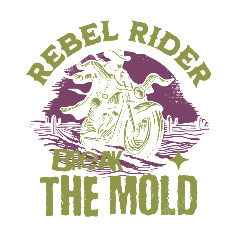 See allThis striking DTF transfer features a rugged, skeletal cowboy figure atop a classic motorcycle, silhouetted against a dusty desert backdrop with cacti. Boldly proclaiming "REBEL RIDER" and "BREAK THE MOLD," this design captures the essence of freedom, independence, and the open road. The vintage-inspired engraving style, with its distinctive olive green and deep purple hues, makes a powerful statement. This high-quality direct to film transfer is ready to press, bringing an edgy, rebellious spirit to any garment. Perfect for motorcycle enthusiasts, independent spirits, and anyone who lives by their own rules, this design is ideal for personalizing apparel for rallies, road trips, or everyday wear. It makes an excellent gift for dads, brothers, friends, or anyone in your life who embodies the "rebel rider" ethos. Whether you're heading to a biker convention, a country music festival, or just want to showcase your unique style, this heat press design is sure to turn heads and spark conversations. Applying this iron on transfer is incredibly simple, making customization accessible for everyone. It adheres beautifully to a wide range of materials including cotton, polyester, and various fabric blends. For best results, use a heat press at 300-325°F for 15 seconds with medium pressure. Even with a household iron, you can achieve fantastic results by applying firm, even pressure. Enjoy the convenience of a ready to press transfer with absolutely no weeding required, saving you time and effort. Our DTF transfers are crafted using professional-grade DTF film and inks, ensuring exceptional durability and a vibrant, crisp finish. The colors are designed to remain rich and true, resisting cracking and peeling even after numerous washes. You'll appreciate the soft hand feel of the final application, which integrates smoothly with the fabric. Experience the premium quality of a professional heat transfer, offering a strong adhesive bond that lasts.