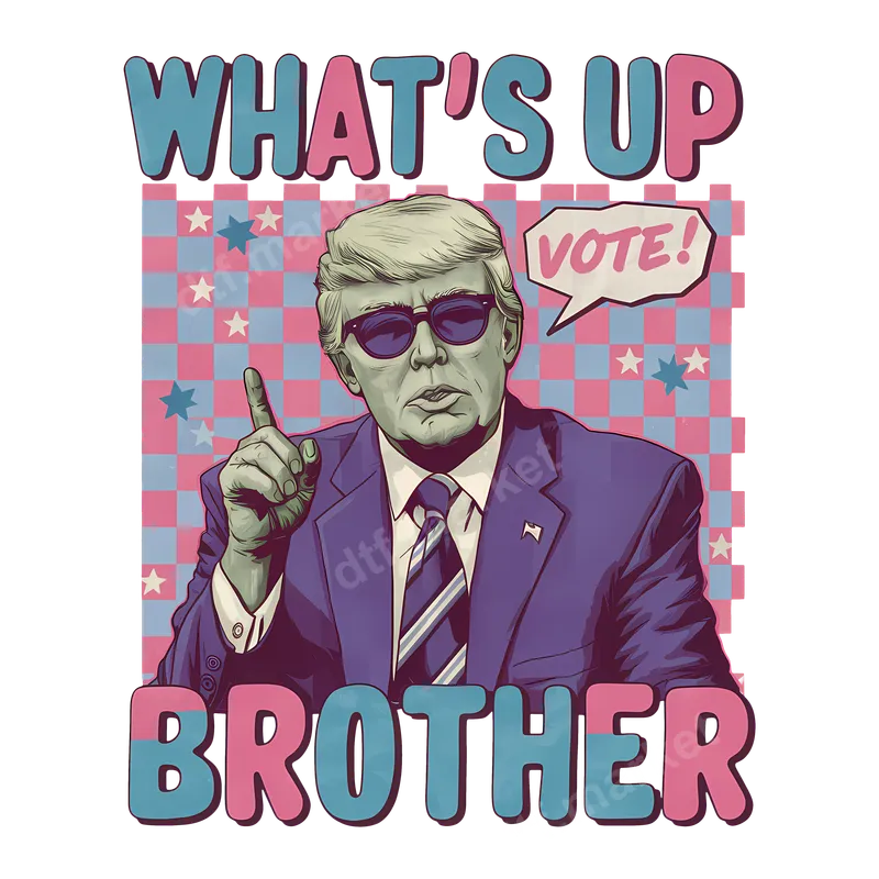See allThe design features a vibrant, pop-art style illustration of Donald Trump in sunglasses, pointing with a speech bubble saying "VOTE!". Bold text above reads "WHAT'S UP" and below "BROTHER," all in a playful, retro aesthetic with a checkered pink and blue background adorned with stars. This eye-catching DTF transfer captures a blend of political commentary and meme culture, making a distinctive statement. It's a completely ready to press transfer, ensuring a hassle-free application for your apparel projects. This unique apparel transfer is ideal for political humor enthusiasts, those who appreciate satirical designs, or anyone looking to express their views with a touch of retro flair. It's perfect for political rallies, casual everyday wear, or as a conversation-starting gift for friends and family with a good sense of humor. Whether for election season events, protest marches, or simply a fun novelty item, this design offers a distinct way to personalize your wardrobe. Our direct to film transfers are incredibly versatile, compatible with a wide range of fabrics including cotton, polyester, and various blends. For best results, use a heat press at 280-300°F for 6-10 seconds with medium pressure, then perform an instant, warm peel. Alternatively, you can achieve great results with a household iron by applying firm, even pressure. The beauty of these heat transfers is that they require no weeding, cutting, or layering, saving you time and effort for a professional finish. Experience superior quality with our professional-grade DTF transfer technology. Each iron on design is known for its exceptionally vibrant colors, excellent wash durability, and resistance to cracking or peeling over time. The transfers are soft to the touch, ensuring comfort on any garment. Crafted from premium DTF film with a strong, reliable adhesive, these heat press designs provide a lasting, high-definition finish that will impress.