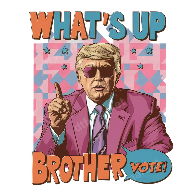 See allThis vibrant DTF transfer features a unique pop-art style caricature of Donald Trump, sporting cool sunglasses and a pink suit, striking a pose with a raised finger. Bold text above reads "WHAT'S UP BROTHER," complemented by a speech bubble below urging "VOTE!". This eye-catching graphic is designed for those who appreciate political humor and civic engagement, arriving as a premium, ready to press heat transfer that makes customizing apparel effortless. This distinct heat press design is perfect for individuals who enjoy political satire, trending memes, or want to make a spirited statement during election season. It’s an excellent choice for political gatherings, themed parties, or simply as a conversation starter. Gift this unique iron on transfer to friends, family, or fellow voters who appreciate humorous and distinctive apparel, or for volunteers at political campaign events. Our high-quality heat press ready transfer adheres flawlessly to various fabrics, including cotton, polyester, and blends. For optimal results, apply with a heat press at 280-300°F for 6-10 seconds with medium pressure, then perform an instant, hot peel. No heat press? A standard household iron can also be used for application. Forget the tedious process of weeding often associated with traditional vinyl transfers – simply press and enjoy! Experience superior durability and aesthetic appeal with this apparel transfer. Each design ensures vibrant, true-to-color hues that remain sharp and resist cracking or peeling, even after countless washes. The finish is notably soft to the touch, providing comfort without stiffness. Crafted with professional-grade DTF film and strong adhesive, this custom transfer guarantees a long-lasting and professional look for all your personalized garments.