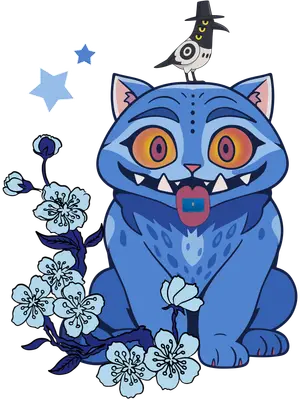 Whimsical Blue Cat & Bird Cherry Blossom DTF Transfer