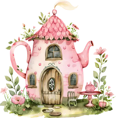 Whimsical Pink Teapot House Watercolor DTF Transfer