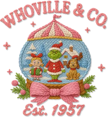 See allEmbrace the holiday spirit with this adorable Whoville & Co. knitted Christmas snow globe DTF transfer. This festive design features a cozy, yarn-textured snow globe enclosing iconic characters, including a Grinch-like figure in a Santa suit, a cheerful Cindy Lou Who with a gift, and loyal Max with antlers, all set against a snowy Whoville backdrop. The charming 'WHOVILLE & CO.' text above and 'Est. 1957' below, also in a delightful knitted style, adds a touch of nostalgic whimsy, making it a truly unique ready to press design for your holiday creations. This delightful design is perfect for anyone who loves classic Christmas tales and a cozy, crafty aesthetic. Ideal for families creating matching holiday outfits, small businesses designing festive apparel, or crafters looking for a unique iron on transfer for gifts. It's an excellent choice for Christmas parties, family gatherings, or as a heartwarming gift for fans of these beloved characters. Bring joy to your holiday season with this heartwarming heat transfer design that evokes childhood memories and festive cheer. Applying this heat press transfer is a breeze on cotton, polyester, cotton-poly blends, and even nylon garments. Simply use a heat press at 300-325°F for 15 seconds with medium pressure, or apply with a household iron. There's no tedious weeding required—just peel and press for instant results! This versatile design is perfect for custom t-shirts, cozy hoodies, festive sweatshirts, unique tote bags, charming pillow covers, adorable baby onesies, and even custom aprons. For lasting durability, wash garments inside out and tumble dry on low heat. Our ready to press transfer boasts vibrant, full-color printing with exceptional fine detail, capturing every stitch of the knitted texture. The design is crack-resistant and offers a soft, lightweight feel, avoiding the heavy texture of traditional vinyl transfers. Each direct to film transfer is meticulously printed on premium DTF film with a strong, reliable adhesive backing, ensuring professional-quality results that will stand out beautifully on any garment.