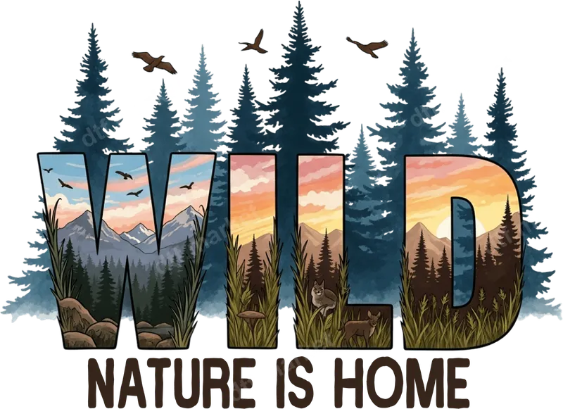 See allThis captivating DTF transfer features the word "WILD" uniquely illustrated with detailed nature scenes, including majestic mountains, serene forests, a vibrant sunset, and subtle wildlife. Below, the heartwarming phrase "NATURE IS HOME" completes the design, evoking a deep connection to the outdoors. This ready to press transfer is perfect for anyone who finds peace and belonging in the wilderness, bringing a touch of adventure to any garment. Ideal for outdoor enthusiasts, hikers, campers, and nature lovers, this heat transfer makes a thoughtful gift for birthdays, Father's Day, or just because. Customize apparel for family camping trips, hiking groups, or simply express your passion for the wild. It's a fantastic choice for creating unique gifts for friends and family who cherish the great outdoors. Our premium DTF transfers are incredibly versatile and easy to apply. Simply use a heat press at 300-325°F for 15 seconds with medium pressure, then cold peel the film. For those without a heat press, a household iron can also be used with firm, even pressure. No weeding or complicated setup is required, making this heat press design a quick way to personalize your items. This iron on decal works beautifully on cotton, polyester, and various fabric blends. Experience the exceptional quality of our direct to film transfers. Designed to be vibrant, highly durable, and crack-resistant, they maintain their rich colors and soft feel wash after wash. Each transfer is printed on professional-grade DTF film with a strong adhesive, ensuring a lasting bond with your chosen garment. This t-shirt transfer provides a professional finish every time.
