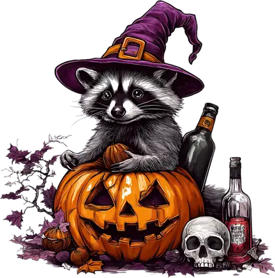 Witchy Raccoon Halloween DTF Transfer - Jack-o'-Lantern & Skull Design