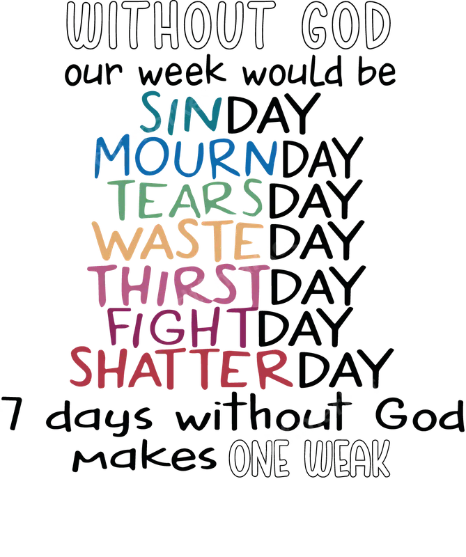 See allThis powerful DTF transfer features a thought-provoking message: "WITHOUT GOD our week would be SINDAY MOURNDAY TEARSDAY WASTEDAY THIRSTDAY FIGHTDAY SHATTERDAY. 7 days without God makes ONE WEAK." The design uses a mix of playful, colorful fonts for the 'day' portions, creating a visually engaging and impactful statement. It’s a perfect ready to press design for anyone looking to express their Christian faith with a touch of clever wordplay and vibrant style. This faith-based iron on transfer is ideal for Christians, church members, youth groups, or anyone who values a spiritual message in their daily life. It makes an excellent gift for pastors, Sunday school teachers, or friends and family who appreciate uplifting apparel. Use this unique heat transfer design for church events, retreats, mission trips, or simply as an everyday reminder of spiritual strength and guidance. Our premium DTF transfers are incredibly versatile and easy to apply. They are heat press ready for cotton, polyester, and various fabric blends, adhering flawlessly with a heat press set at 300-325°F for 15 seconds at medium pressure. You can even use a household iron for smaller applications. Enjoy the convenience of no weeding or masking required, making your custom apparel projects quick and effortless. Experience professional-grade results with every apparel transfer. These vibrant designs are crack-resistant, peel-proof, and boast a soft, flexible feel that seamlessly integrates with the garment. Our durable DTF film and strong adhesive ensure your design remains vivid and intact, wash after wash, giving your custom t-shirts and other items a long-lasting, high-quality finish.