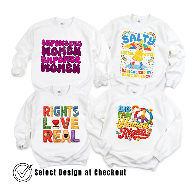 See allOur vibrant DTF transfers celebrate women's empowerment, human rights, and progressive values. Featuring slogans like "Empowered Women Empower Women," "Salty Liberal Witch Radicalized by Basic Decency," "Rights Love Real," and "Big Fan of Human Rights," these ready to press designs are perfect for making a statement. Each direct to film transfer boasts bright colors and clear details, ensuring your message stands out. These powerful designs are ideal for feminists, activists, and anyone who champions social justice and equality. Whether you're attending a rally, celebrating International Women's Day, or expressing your beliefs, these heat press designs empower you to wear your values. They make thoughtful gifts for like-minded friends, allowing them to create custom apparel. Applying your DTF transfer is simple and accessible. These versatile iron on transfers work on cotton, polyester, and blends. Use a heat press at 300-325°F for 15 seconds with medium pressure, then cold peel. A household iron can also work. These ready-to-press transfers require no weeding, saving time for your custom t-shirt projects. We provide premium quality DTF transfers built to last. Our direct to film transfers feature vibrant, sharp colors and details. Crafted from durable, crack-resistant DTF film with strong adhesive, these apparel transfers offer a soft feel once applied. Enjoy long-lasting wear and exceptional washability, keeping your message clear and impactful.
