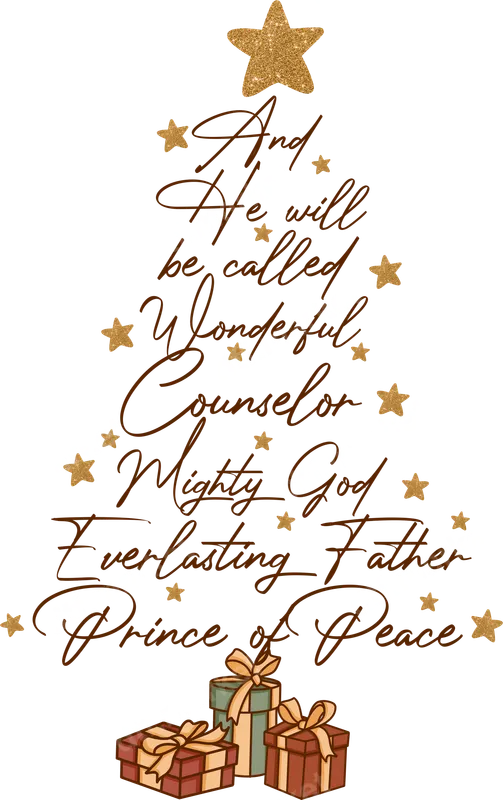 See allEmbrace the spirit of Christmas with our beautiful 'Wonderful Counselor' DTF transfer. This inspiring design creatively forms a Christmas tree using the powerful scripture from Isaiah 9:6: 'And He will be called Wonderful Counselor, Mighty God, Everlasting Father, Prince of Peace.' Adorned with sparkling gold glitter-look stars and festive gift boxes at the base, this ready to press transfer exudes warmth and spiritual joy, making it a perfect addition to your holiday apparel or home decor. This unique design is ideal for devout Christians, church groups, or anyone who cherishes the religious significance of Christmas. It makes a thoughtful and personal gift for family, friends, or fellow congregants during the holiday season. Imagine creating custom t-shirts for Christmas caroling, festive family gatherings, or as a meaningful present for a pastor or Sunday school teacher. This versatile iron on transfer is perfect for spreading a message of faith and hope throughout the season. Applying this design is incredibly simple with a heat press. Just set your press to 300-325°F and apply for 15 seconds – no weeding, no complicated layering! Our premium heat press transfer works beautifully on a wide range of materials, including cotton, polyester, and their blends. Transform t-shirts, hoodies, sweatshirts, tote bags, aprons, and even Christmas stockings into personalized, faith-filled statements with ease. Experience superior quality with our direct to film transfers. Crafted with vibrant, fade-resistant inks and a crack-resistant finish, your design will stand the test of time and wash after wash. The soft-touch feel ensures maximum comfort, while the strong adhesive guarantees a secure bond to your chosen garment. Elevate your creations with dtf.market's durable and professional-grade apparel transfers, designed for lasting beauty and easy application.