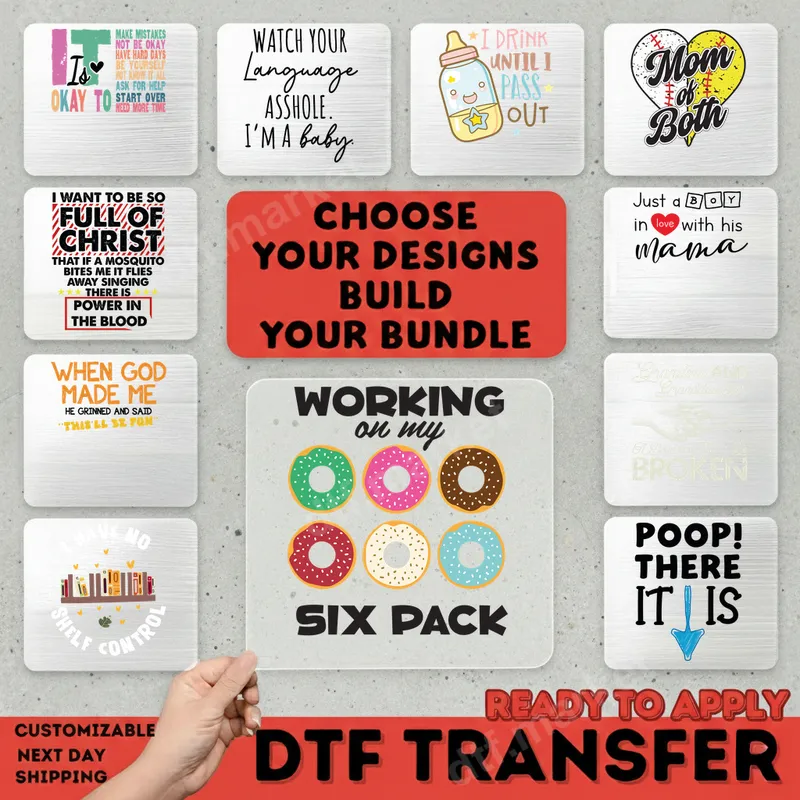 See allThe "Working on My Six Pack" DTF transfer features a playful design combining fitness aspirations with a love for donuts. This humorous graphic showcases six colorful, delicious-looking donuts arranged in a grid, accompanied by the witty phrase. It's a perfect blend of sarcasm and sweetness, ideal for those who appreciate a good laugh and a good treat. This high-quality DTF transfer is vibrant and ready to press onto your favorite apparel. This ready to press transfer is perfect for fitness enthusiasts who don't take themselves too seriously, donut lovers, or anyone who enjoys clever, food-related humor. It makes an excellent gift for gym buddies, bakers, friends with a sweet tooth, or even as a treat for yourself. Great for casual wear, gym outfits, foodie events, or just bringing a smile to someone's day. Our durable heat press design works beautifully on a wide range of fabrics, including cotton, polyester, and various blends. For best results, apply using a heat press at 300-325°F for 15 seconds with medium pressure. It can also be applied with a household iron, following specific instructions. Unlike vinyl transfers, these iron on decals require absolutely no weeding, saving you time and effort for a professional finish every time. Expect exceptional quality with this apparel transfer. Each image is printed with vibrant, long-lasting colors that resist cracking, peeling, and fading, ensuring your design stays fresh wash after wash. The professional DTF film provides a soft, flexible feel on your garment, making it comfortable to wear. With strong adhesive properties, your design will bond securely, making it a permanent addition to your wardrobe.