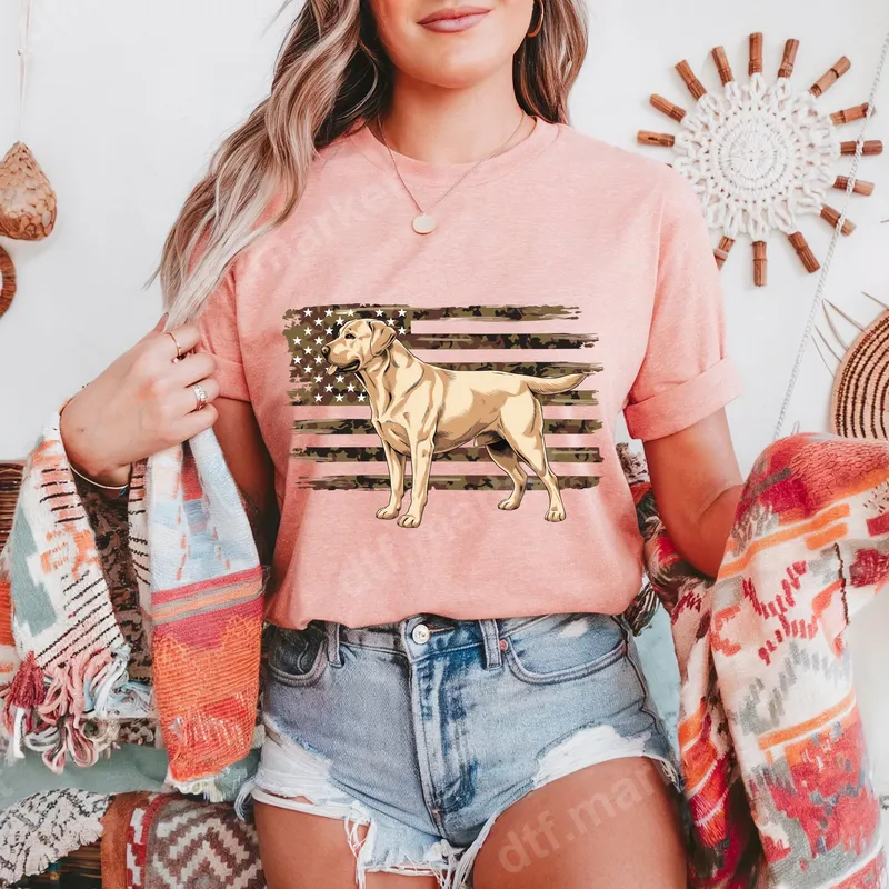 See allShow your love for America and canine companions with this striking Yellow Labrador DTF transfer. This ready to press design features a beautifully rendered Yellow Lab standing proudly against a distressed American flag background, artfully designed with a camouflage pattern. It captures a spirit of loyalty and patriotism, perfect for personalizing apparel and accessories with a unique, stylish flair. This versatile design is ideal for dog owners, Labrador enthusiasts, military families, and veterans who cherish their country and pets. It makes an excellent gift for Father's Day, Memorial Day, Fourth of July, or as an everyday statement piece. Create custom gifts for friends and family, or express your unique style at outdoor events, dog shows, and casual gatherings. This heat press design is a must-have. Our premium heat transfer is incredibly easy to apply, whether you’re using a professional heat press or a household iron. For best results, apply at 300-325°F for 15 seconds with medium pressure. This high-quality iron on transfer adheres perfectly to cotton, polyester, and most fabric blends. Forget weeding; simply press and peel to reveal your stunning new garment. Enjoy a truly hassle-free application for a professional finish. Experience superior quality with our durable direct to film transfer. Each design boasts vibrant colors, exceptional detail, and a soft-to-the-touch finish that won't crack, peel, or fade, even after multiple washes. Crafted using professional-grade DTF film and strong adhesive, this apparel transfer ensures long-lasting wear and a beautiful appearance on all your chosen items. Elevate your wardrobe with a transfer that combines stunning visuals with robust durability.