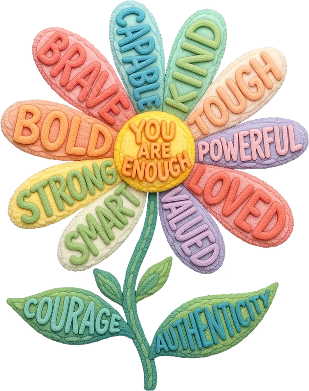 See allImmerse yourself in positivity with this beautifully textured "You Are Enough" affirmation flower DTF transfer. This vibrant, ready to press design features a playful, almost felt-like texture with words like "Brave," "Bold," "Kind," "Tough," "Powerful," "Loved," "Valued," "Smart," "Strong," and "Capable" forming the petals, while "Courage" and "Authenticity" adorn the leaves. It's a perfect visual reminder of inner strength and self-worth, making it an uplifting addition to any garment or accessory. This inspirational heat transfer is ideal for anyone seeking a boost of self-confidence or wanting to spread positive vibes. It's a thoughtful gift for women, teens, and young adults, perfect for self-care packages, mental health awareness events, or simply as an everyday reminder of personal strength. Create unique custom apparel for friends, family, or yourself with this empowering message. Applying this high-quality iron on decal is effortless. Our direct to film transfer works wonderfully on a wide range of materials, including cotton, polyester, and various fabric blends. For best results, use a heat press at 300-325°F for 15 seconds with medium pressure, or apply with a household iron following similar temperature guidelines. Best of all, there's no weeding required, saving you time and effort. Experience superior quality with every heat press design. Our professional-grade DTF transfers deliver incredibly vibrant colors and sharp details that are crack-resistant and soft to the touch. Made with durable DTF film and strong adhesive, these apparel transfers are designed for longevity, ensuring your empowering message stays bright and intact wash after wash.