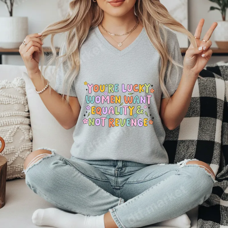 See allThis eye-catching DTF transfer features the humorous and empowering phrase "YOU'RE LUCKY WOMEN WANT EQUALITY & NOT REVENGE" in a vibrant, retro-inspired bubble font. Adorned with playful floral accents, this ready to press design brings a sassy and positive vibe to any garment. It's the perfect way to make a statement with a touch of lighthearted charm, celebrating women's strength and the pursuit of fairness. Ideal for feminists, humor enthusiasts, or anyone who appreciates a witty remark, this heat transfer makes a fantastic gift for friends, sisters, or mothers. Perfect for International Women's Day, protests, casual wear, or just adding a personal touch to your everyday wardrobe. Show off your attitude and support for equality with this unique heat press design that is sure to spark conversations. Applying this durable iron on transfer is simple with a standard heat press. It adheres beautifully to a wide range of materials, including cotton, polyester, and their blends. For best results, press at 300-325°F for 15 seconds with medium pressure. Unlike traditional vinyl transfers, there's no weeding required, making custom apparel creation quick and effortless. This t-shirt transfer ensures a smooth, professional finish every time. Crafted using premium DTF film and high-quality inks, this direct to film transfer boasts exceptional color vibrancy and durability. The design is crack-resistant, fade-resistant, and incredibly soft to the touch, ensuring your custom creation looks fantastic wash after wash. Enjoy professional-grade results that stand out, making your apparel truly unique and long-lasting.