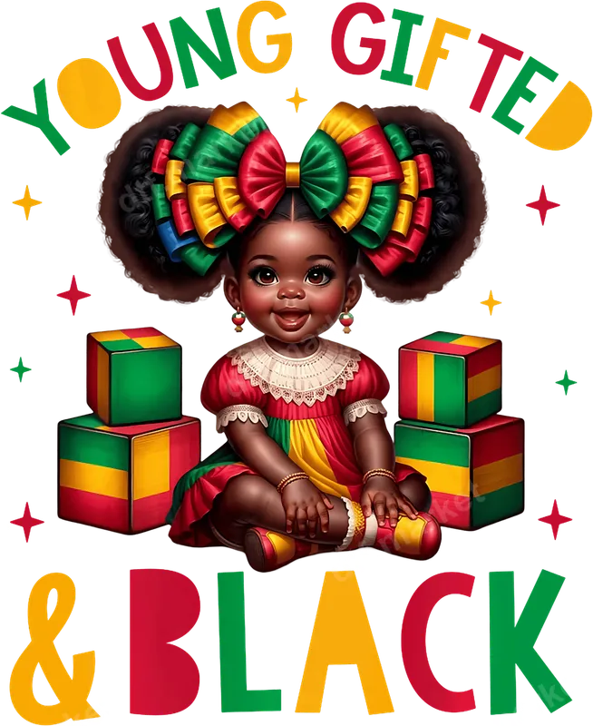See allThis vibrant DTF transfer features an absolutely adorable baby girl, radiating joy and confidence, with the empowering message "Young, Gifted & Black." She's depicted with big, beautiful afro puffs adorned with a stunning red, green, and gold bow, matching her dress and the surrounding building blocks. This uplifting design celebrates Black excellence and identity, making it a perfect statement piece. It's a high-quality, ready to press transfer that brings a powerful and positive vibe to any garment. This design is ideal for parents, guardians, and anyone who wants to celebrate the potential and beauty of Black children. It's perfect for Black History Month, Kwanzaa celebrations, Juneteenth, birthdays, baby showers, or as an everyday affirmation of pride. Use it to create meaningful gifts for new moms, grandmothers, or for children's events and community gatherings focused on empowerment. It makes a fantastic custom transfer for family reunion shirts or matching outfits. Applying this iron on transfer is a breeze on various fabrics, including cotton, polyester, and their blends. For best results, use a heat press at 300-325°F for 15 seconds with medium pressure, then warm peel. A household iron can also be used with firm, even pressure. Unlike vinyl transfers, this direct to film transfer requires no weeding, saving you time and effort. Simply press and reveal a professional, long-lasting design. Our heat press design uses premium DTF film and vibrant, eco-friendly inks, ensuring your apparel transfer is not only stunning but durable. The colors are incredibly vivid and won't crack, peel, or fade, even after multiple washes. You'll appreciate the soft, smooth feel of the design on the garment, unlike bulky traditional methods. This ensures a comfortable wear while proudly displaying the empowering message.